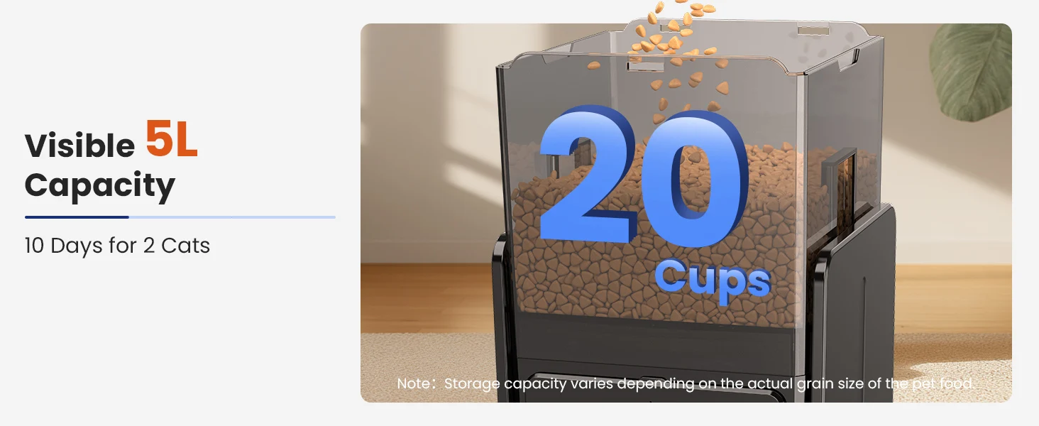4.Grande capacité de 5 litres pour les voyages courts : cette mangeoire peut contenir jusqu'à 5 L (20 tasses) de nourriture sèche pour chat, suffisamment pour nourrir deux chats adultes pendant 10 à 15 jours, parfaite pour les escapades du week-end ou les courts voyages d'affaires.Le réservoir alimentaire transparent vous permet de vérifier les niveaux des aliments en un coup d'œil, tandis que le sac déshydratant intégré garde les aliments frais.Le couvercle sécurisé empêche les déversements et empêche les chats de trop manger lorsque vous n'êtes pas là.
