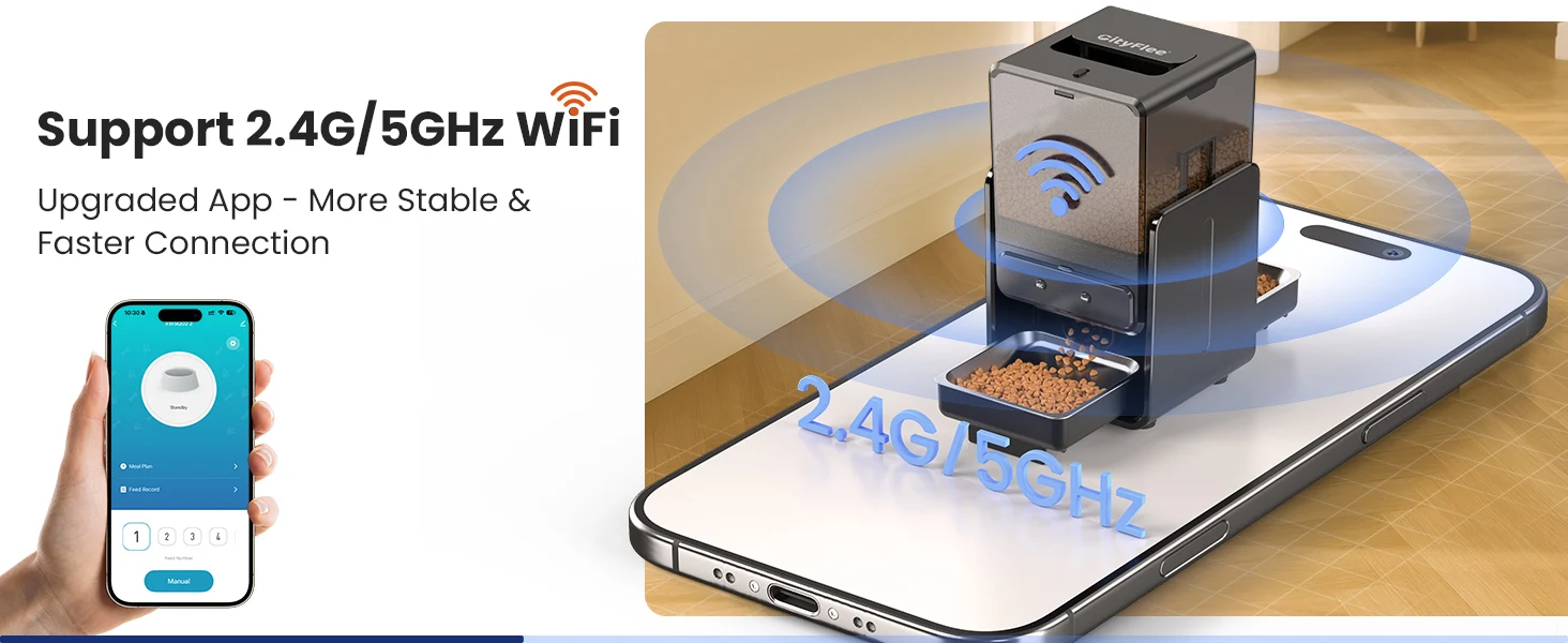2.Connectivité Wi-Fi 5G et 2,4G fiable : la mangeoire automatique pour chat Cityflee prend en charge les réseaux Wi-Fi 5G et 2,4G.Contrairement aux modèles simples 2,4 G, cette alimentation avec capacité 5G offre des performances réseau plus stables : vous n'aurez jamais à craindre de perdre l'accès à distance au chargeur lorsque vous n'êtes pas chez vous, vous garantissant ainsi de contrôler les programmes d'alimentation à tout moment.
