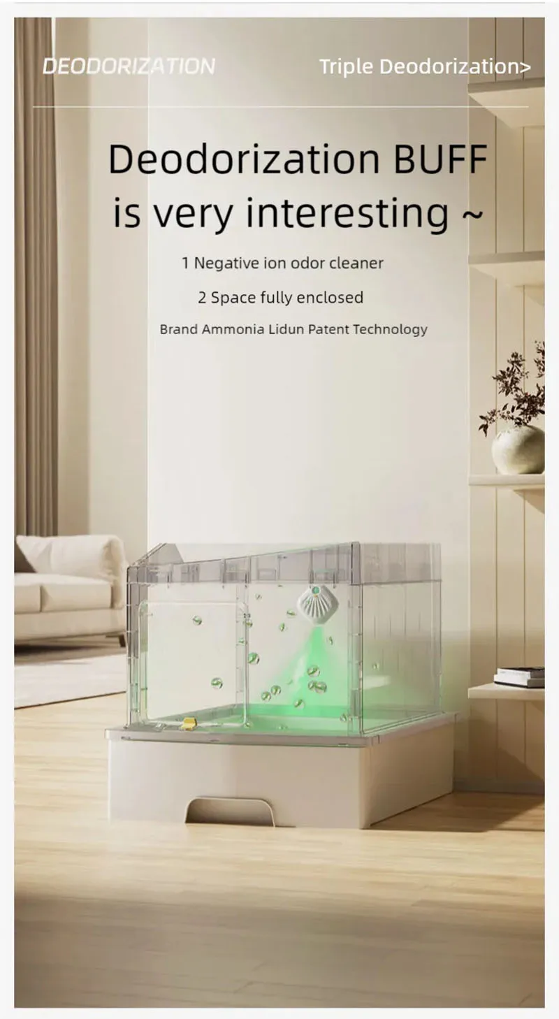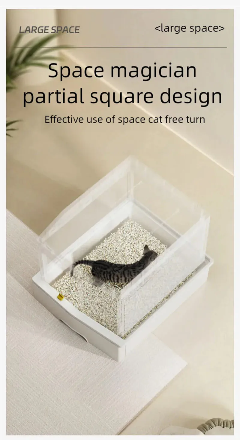 Ce nouveau bac à litière entièrement fermé est conçu pour révolutionner l'hygiène chez vous. Son design unique avec entrée inférieure et sortie supérieure force le chat à passer par le dessus, nettoyant les pattes et garantissant que la litière reste dans la boîte.