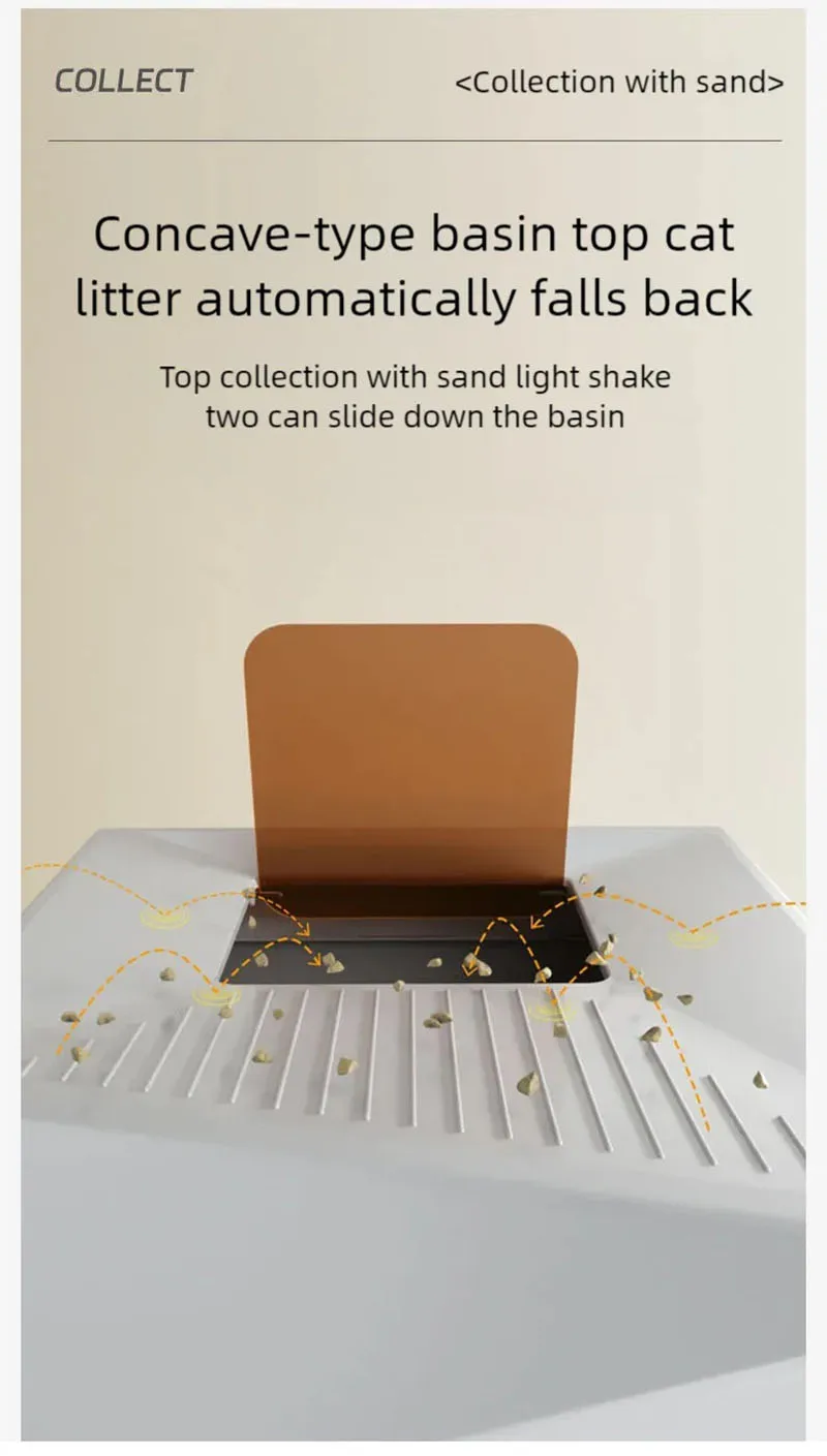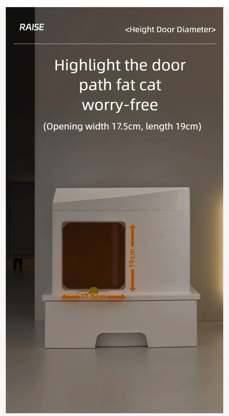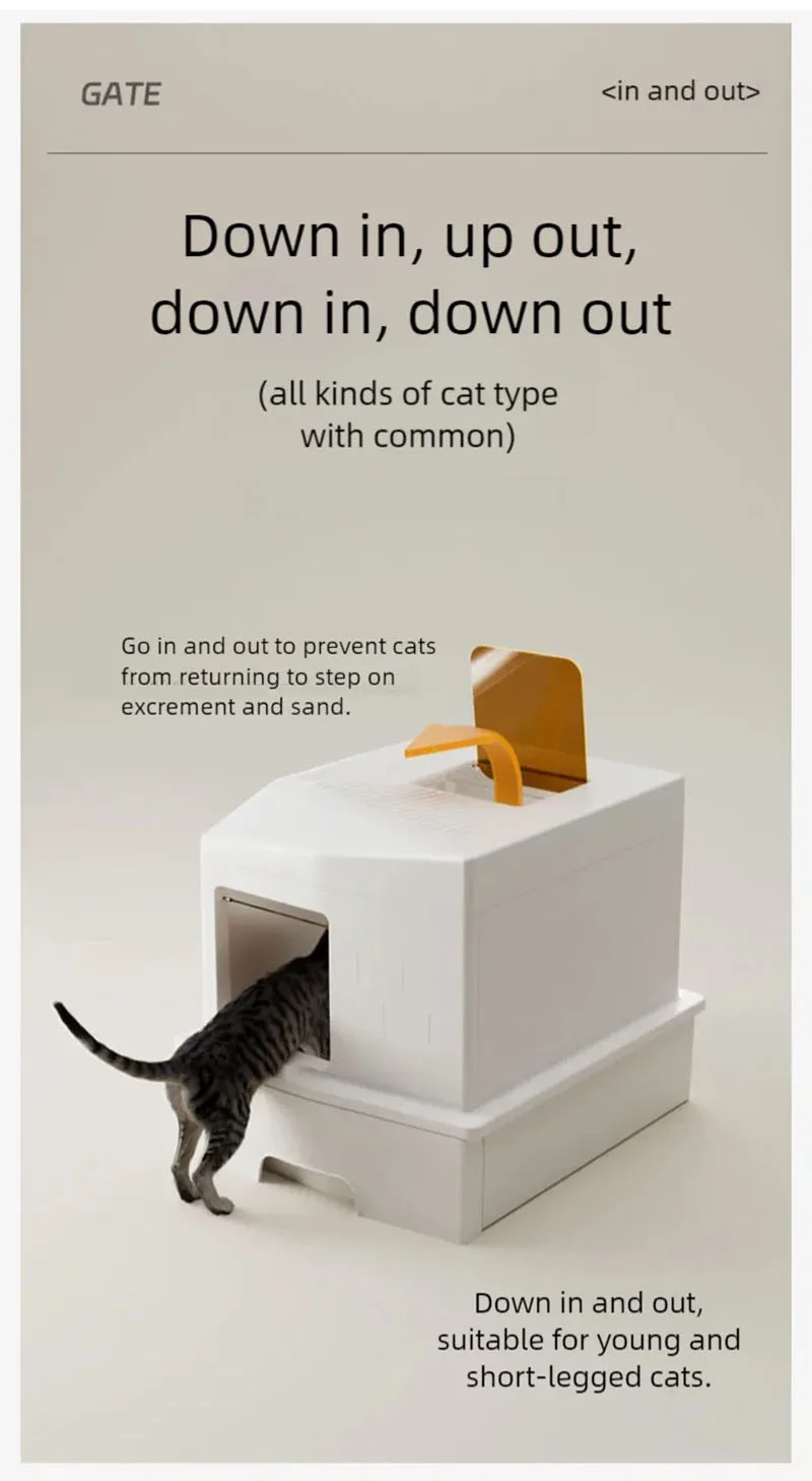 • Contrôle Anti-Éclaboussures Parfait : La sortie supérieure empêche les projections de litière à l'extérieur. L'animal doit sauter sur le couvercle (conçu pour cela) avant de sortir, les grains tombent à travers le couvercle dans le bac.